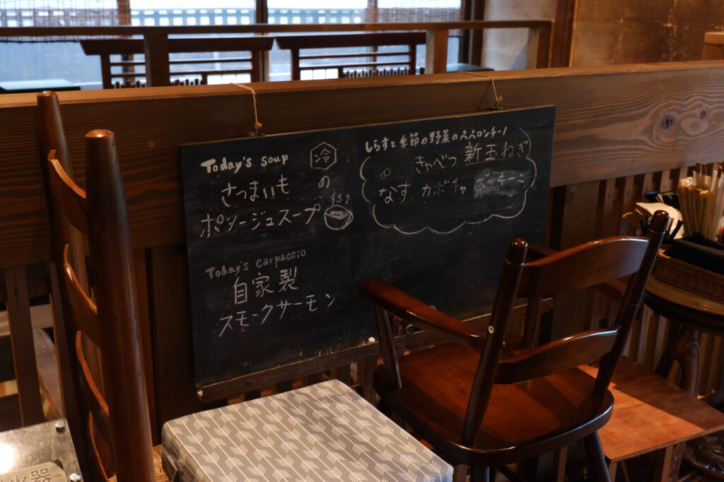 重厚な梁や建具など、歴史的価値の高い建築意匠が随所に残されており、伝統的な空間の中で地域の食材を活かした料理やカフェメニューを楽しむことができます。
