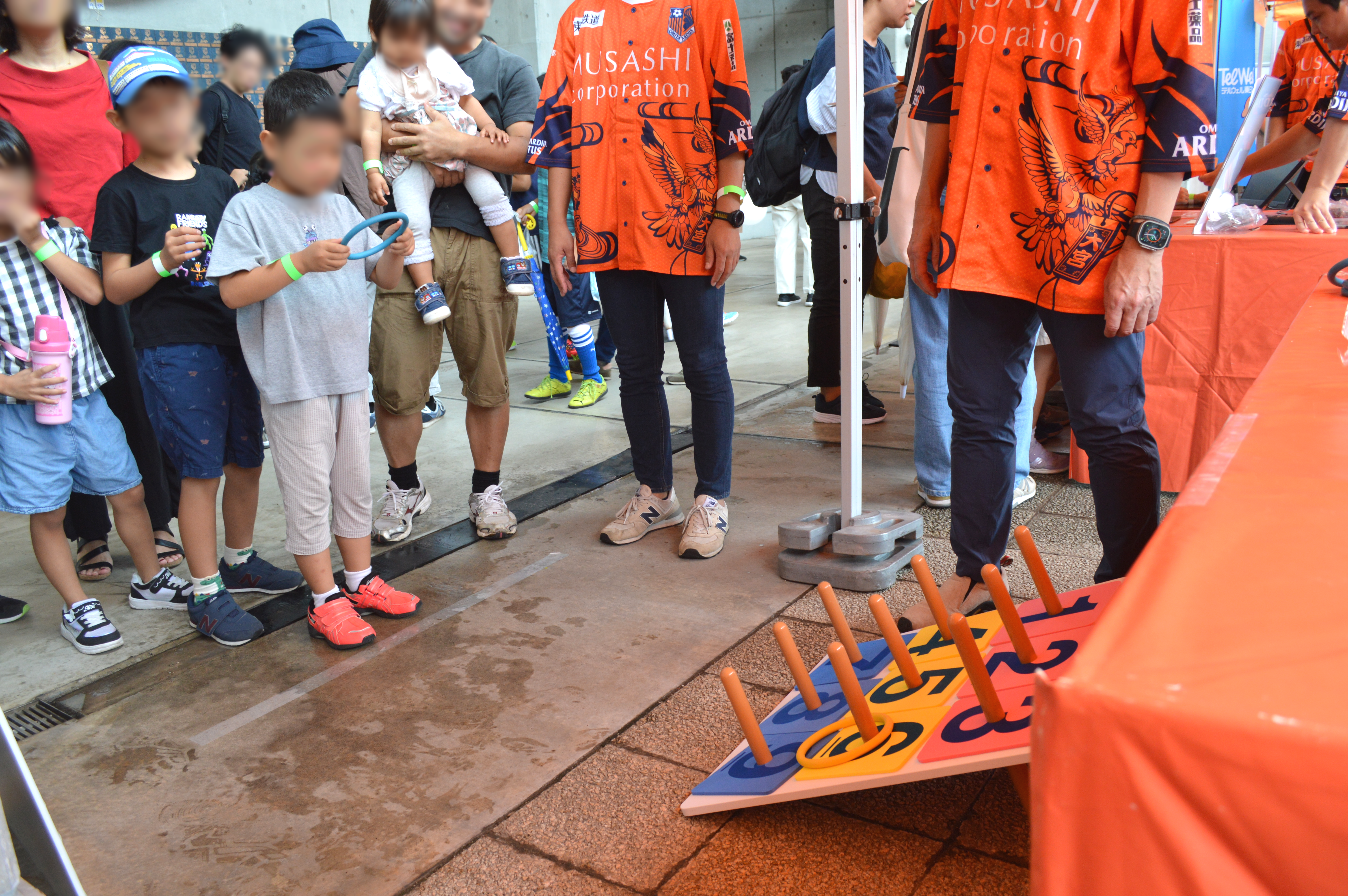 輪投げをして入った番号の防災クイズに答えて正解するとお菓子がもらえるゲームで、沢山の親子連れにご参加いただきました。