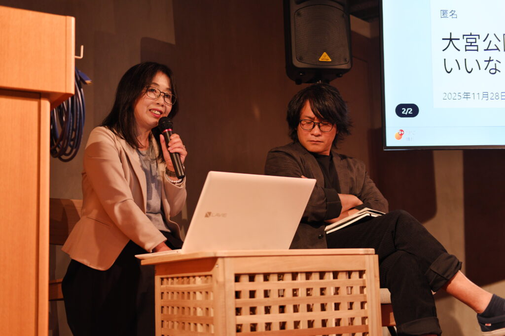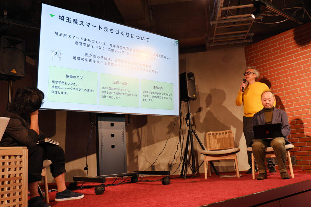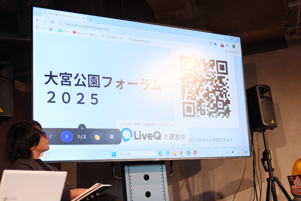 大宮公園検討グループに参画する、「株式会社シンプランニング」五⼗嵐伸幸様、「プロケイダ合同会社」相⾺功様、私たち「一般社団法人埼玉県スマートまちづくり」の代表理事である山田隆之の3社による今年度の活動報告と、LiveQを活用した意見交換が行われました。